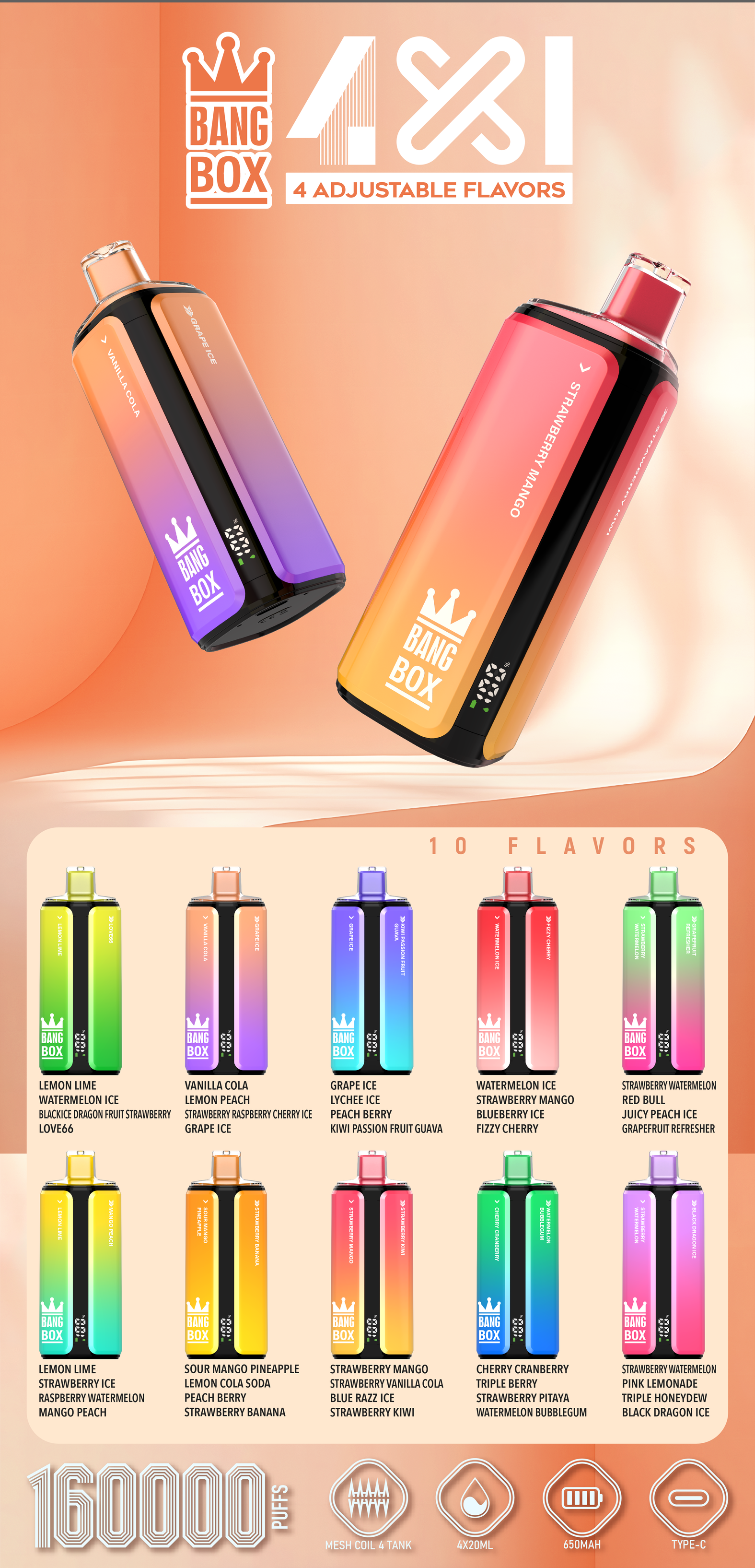 O Bang Box 160K 4 em 1 é um cigarro eletrônico descartável de alta capacidade, projetado para desempenho duradouro e variedade de sabores. Com autonomia de até 160.000 vaporizações, possui 4 compartimentos separados de 20ml para e-líquido, totalizando 80ml de capacidade, permitindo que os usuários desfrutem de quatro sabores puros em um único vapor. Alimentado por uma bateria recarregável de 850mAh com porta de carregamento Tipo-C, garante potência estável e confiável durante uso prolongado. Disponível nas concentrações de nicotina 0%, 2%, 3% e 5%.Bang Box 160KAtende a uma ampla gama de preferências de vaporização. E 10Sabores populares à sua escolha, embalados em caixas com 10 unidades, uma excelente opção para mercados de varejo e atacado.